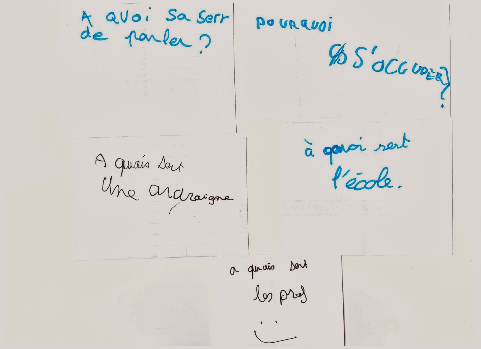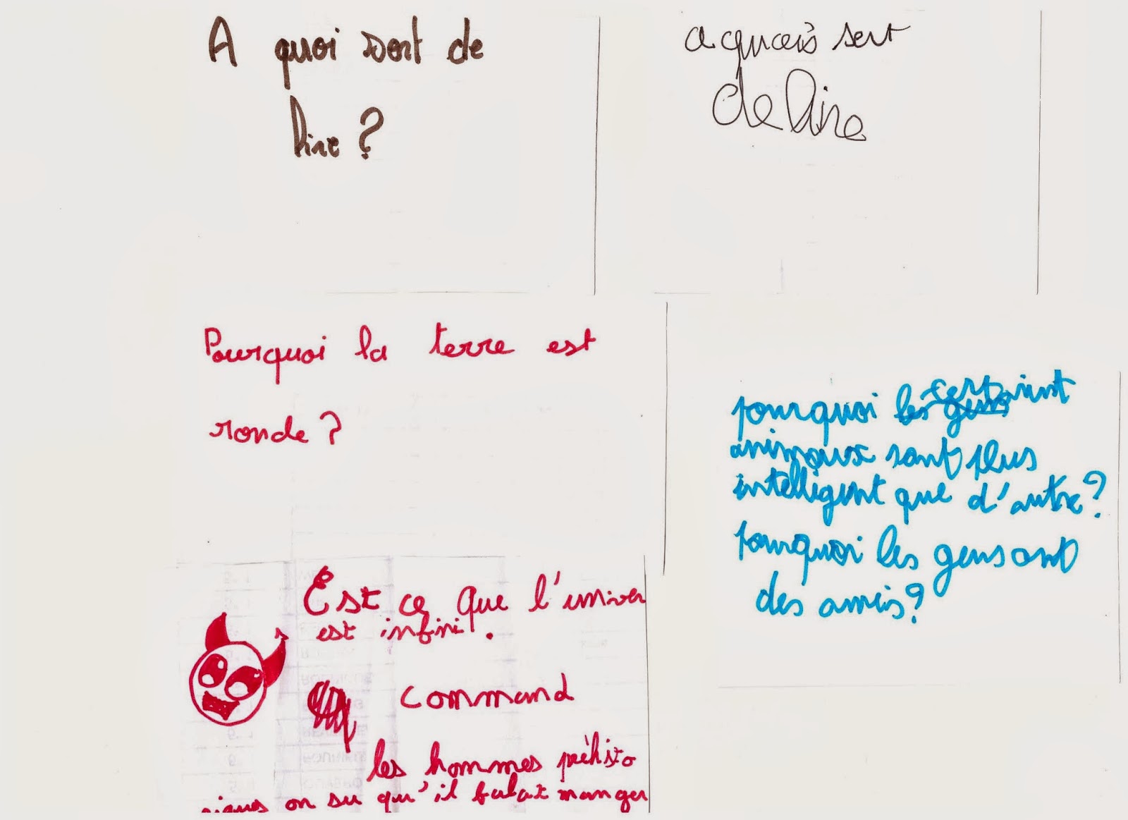 J’ai choisi pour cette séance des questions qui intéressent les élèves sans être vraiment philosophiques. Je retenterai l’expérience car pour le moment l’agitation du groupe ne m’a pas permis de savoir si ces questions les aidaient à mieux s’exprimer.