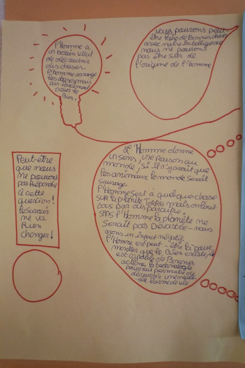 La séance a débuté par un débat autour du sujet proposé par un élève la séance précédente. A quoi sert l’Homme dans l’Univers? Les élèves ont discuté sur la question pendant 35 minutes, ils avaient encore beaucoup de choses à dire et se sont passionnés pour le sujet. Il y avait 15 élèves. Essentiellement des élèves de 3e, une quatrième et un cinquième. Je n’ai presque pas eu besoin d’intervenir les élèves s’organisaient et s’auto-disciplinaient pour la discussion.